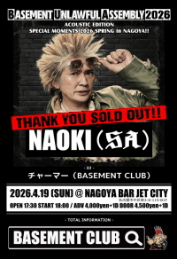 ■4/19(日) UP 名古屋 BAR JET CITY (愛知県名古屋市中区栄3-8-115サンリツビルNorthB1F) "BASEMENT UNLAWFUL ASSEMBLY 2026 ACOUSTIC EDITION / SPECIAL MOMENTS 2026 SPRING in NAGOYA!!" OPEN 17:30 START 18:00 ADV ¥4,000(+1D) DOOR ¥4,500(+1D) 【LIVE】NAOKI (SA) 【DJ】チャーマー (BASEMENT CLUB) ※自由席30人迄 ※整理番号有り(予約順) THANK YOU SOLD OUT!! 予約分にキャンセルが出た場合や、会場側との調整により新たに立ち見席を設定・販売する場合は、都度SNSにてアナウンスいたします。 |