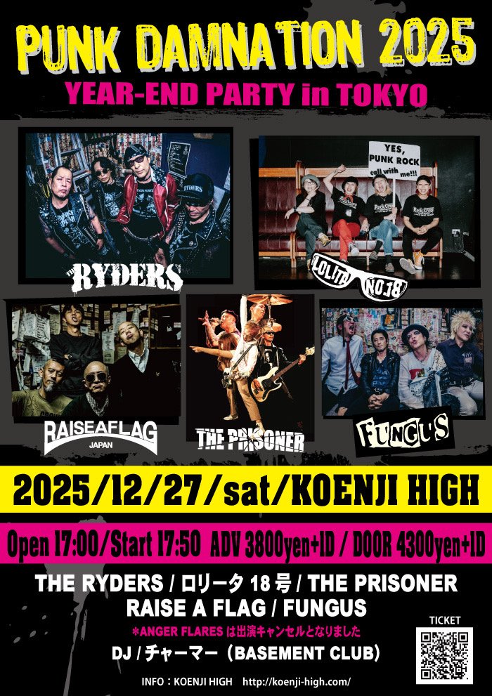 ■12/27(土) 東京 高円寺 HIGH "PUNK DAMNATION 2025" OPEN 17:30 START 18:10 ADV ¥3,800(+1D) DOOR ¥4,300(+1D) 【LIVE】THE RYDERS / 【DJ】チャーマー (BASEMENT CLUB) ※出演を予定しておりました"ANGER FLARES"は、ボーカルYUICHI氏の体調不良により出演キャンセルとなり、代わりに"RAISE A FLAG"と"FUNGUS"の出演が決定しました。 ★一般前売チケット ・イープラス ※チケット予約可 |